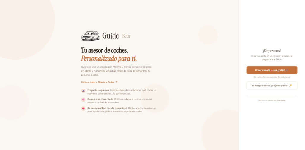 Alberto y yo hemos volcado en Guido lo que sabemos de coches, lo que hemos aprendido probando y analizando modelos, y lo que creemos que puede ser útil para alguien que está en ese proceso de compra que, seamos honestos, puede ser bastante estresante.